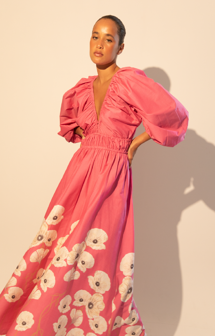 FIT. Vestido maxishort con escote en V ajustable y mangas voluminosas que aportan dramatismo y elegancia. Falda en linea A con fruncido en cintura que realza la silueta.